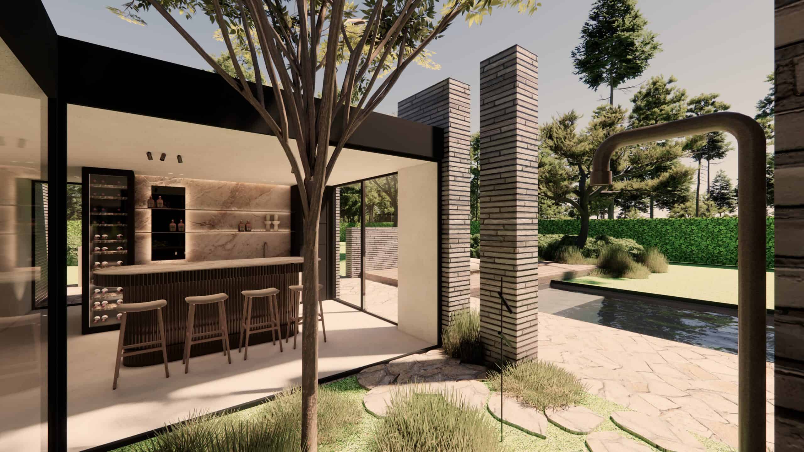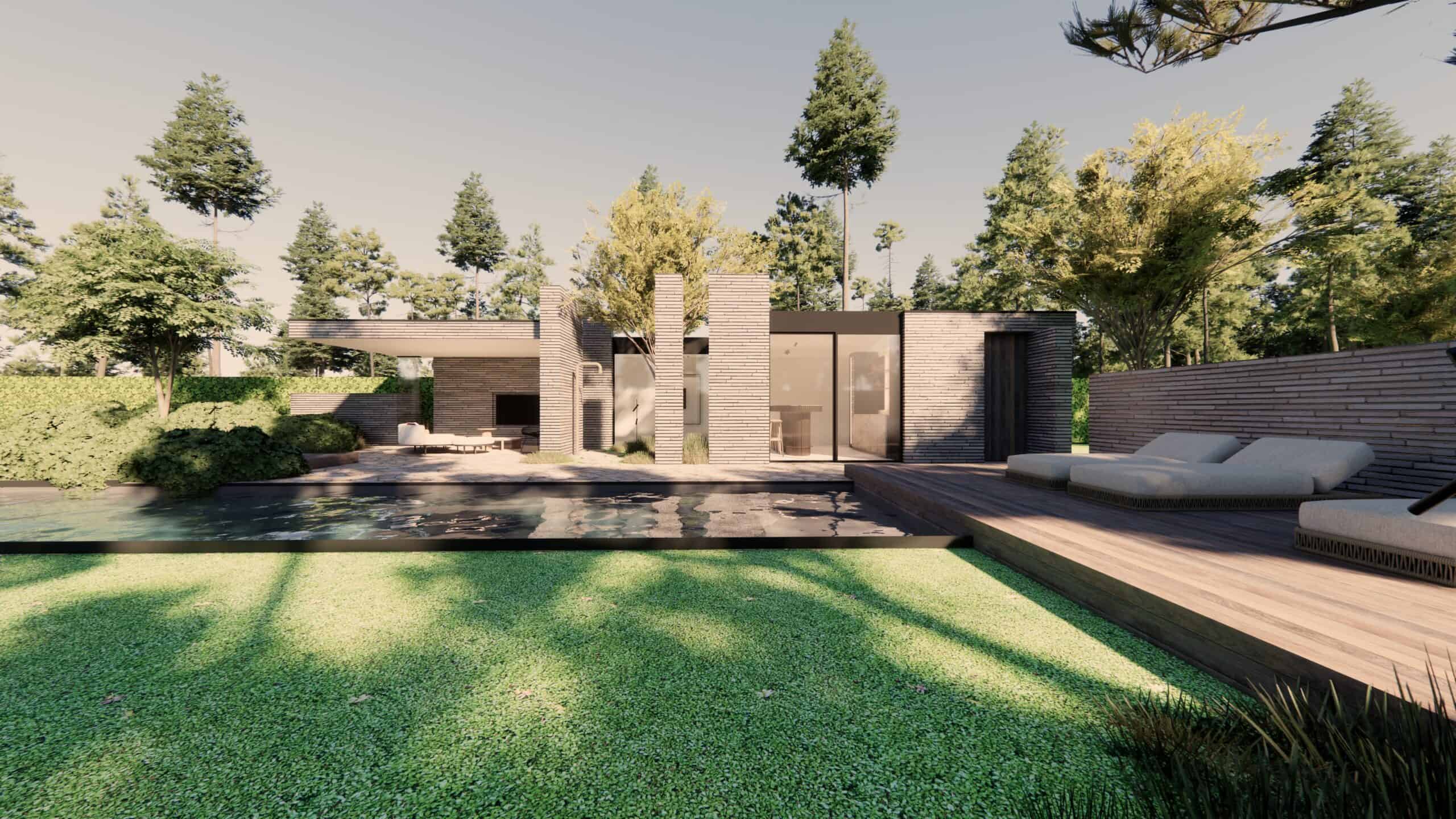 Buiten speelt het ontwerp met volumes, lijnen en licht. Water, groen en architectuur worden met elkaar verweven tot één geheel. Elk detail is gekozen om de rust te versterken, zonder afstandelijk te worden.