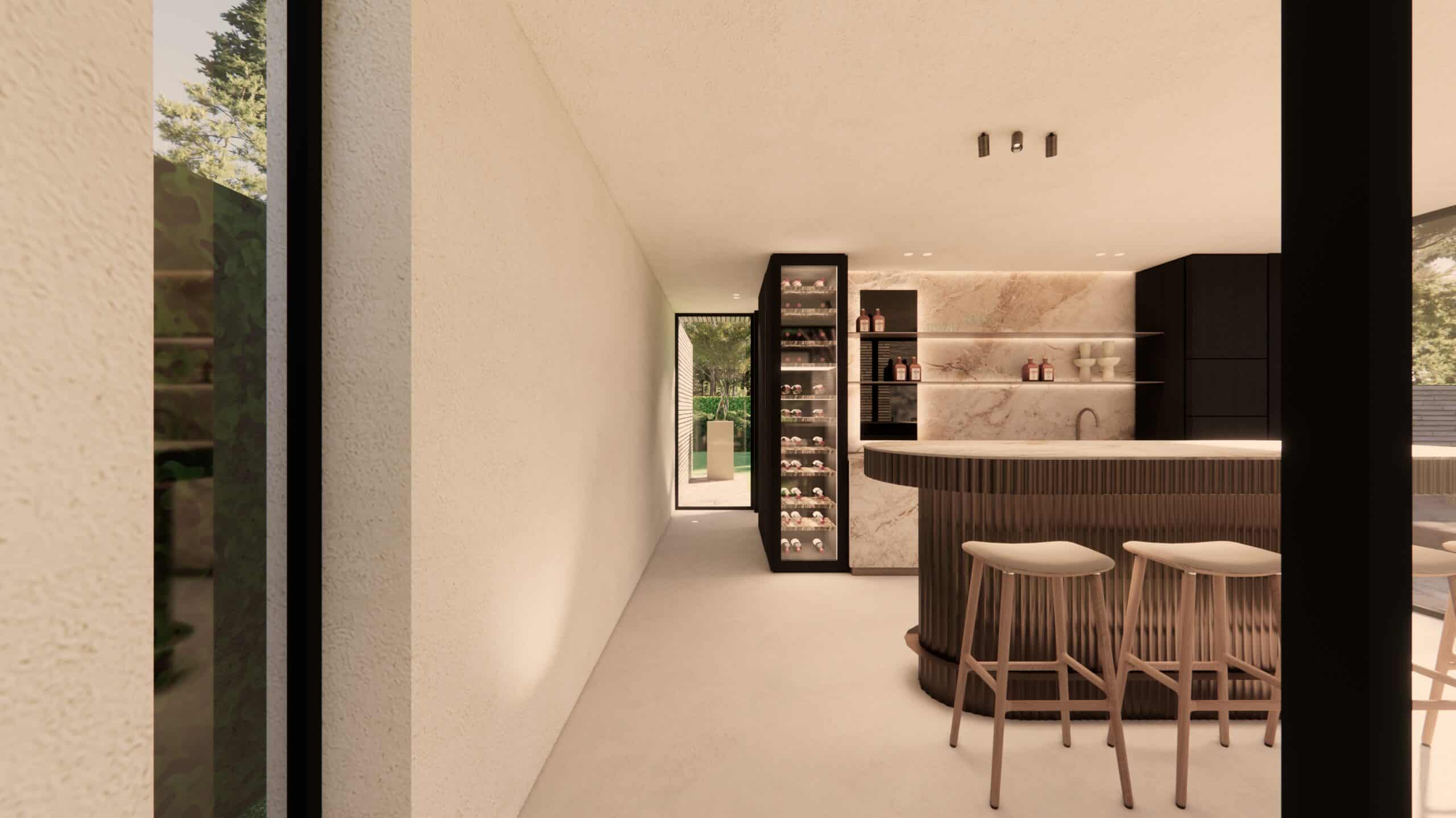 Binnen wordt je verwelkomd door maatwerk tot in het kleinste detail: een elegante bar in natuursteen, een ingebouwde wijnkast die uitnodigt tot lange zomeravonden met vrienden, en een sfeervolle zithoek met zicht op het groen. De gekozen designmeubels tillen het geheel naar een hoger niveau, met oog voor comfort én esthetiek.